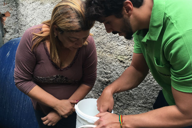 Rita keeps this white bucket under her front stairs. It contains a small packet of mosquito eggs, a few pellets of fish food and water. Together, these form an ideal breeding atmosphere for the Wolbachia-infected mosquitoes. Gabriel and colleagues come to inspect and refresh the contents every two weeks. Rita says she has not noticed a higher number of mosquitoes in the community, and her point of view has changed. "When I see them I don't kill them. I let them fly. I am not afraid of them... Now, to me, it is like a privilege to have the mosquitoes here."