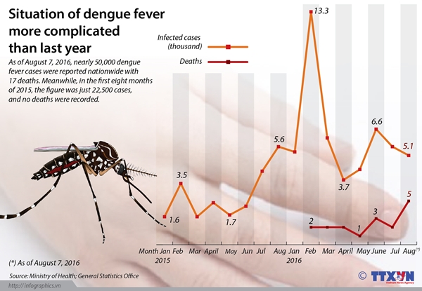 Statistics from the Health Ministry's General Department of Preventive Medicine showed that the number of people that contracted dengue fever in the first six months of this year reached over 44,800, more than 2.5 times higher than the same period last year.