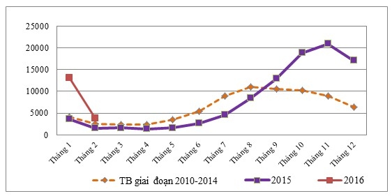Number of Dengue cases reported by month in 2015 and 2016 and median number of cases by month for 2010-2014, General Department of Preventative Medicine, Ministry of Health, Viet Nam |