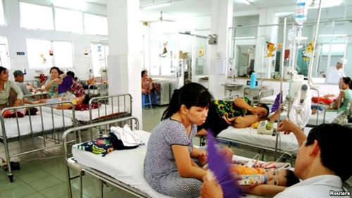 Vietnamese parents look after their children in a room designated for the treatment of dengue fever at Ho Chi Minh City's pediatric hospital. |