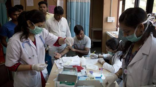 A patient has his blood taken to be tested at a fever clinic especially set up to cater to those suffering from fever, one of the main symptoms of several mosquito-borne diseases such as dengue, at a hospital in New Delhi, India, Sept. 15, 2016. |