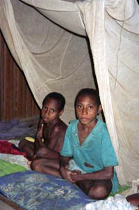Two boys sit under a net in Patigo, Papua New Guinea in this file photo. While indoor spraying and insecticide treated bed nets have been important tools for malaria control, mosquitos are becoming resistant to such measures. |