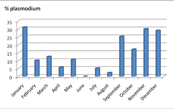 - In 2014, Plasmodium in January increased by 280% while reduced from 24 to 100% in other months. Especially the last 2 months (November and December) of 2014, Plasmodium parasite surged from 28.6 to 93.3% in comparison with the same period in 2013.