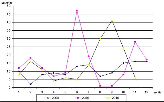 The developments of scrub typhus in Khanh Hoa from 2008 to November 2010 is presented in Chart 1 (the data of patients were collected from the Provincial General Hospital, District Medical Center of Ninh Hoa, the Hospital 87 Nha Trang).