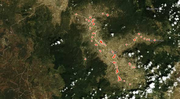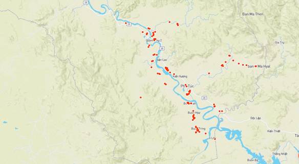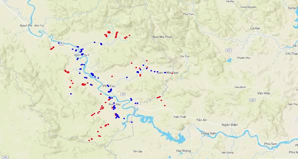 Remarks: The MPs’ living locations were mainly in two sides of the Ba River valley and one river branch originating from the watershed forest Ia M'Lah. Areas far from river valley are less populated.