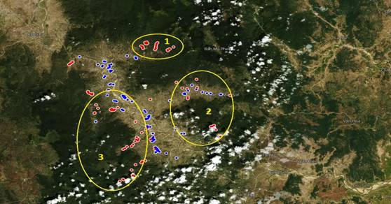 Remarks: The points on the map indicate the MPs’ residence and malaria-infected places in the communes of Krong Pa district with the red color corresponding to suspected places of malaria infection and blue to the living places of patients. Suspected locations of malaria infection are mainly concentrated in three clusters that are circled yellow on the map. Cluster 1 is of the forestal area Ia RSai - Churam, cluster 2 is of the watershed area Ia M'Lah, cluster 3 is of the conservation forest Ea So.