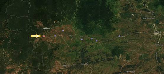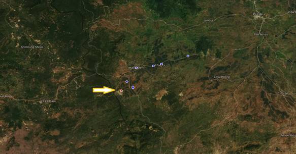 Remarks: The MPs were mainly found in Kroong commune. This group has cultivation activities in their residence places. on the map, the red dots represent the locations where MPs went to for cultivation following the yellow arrow.