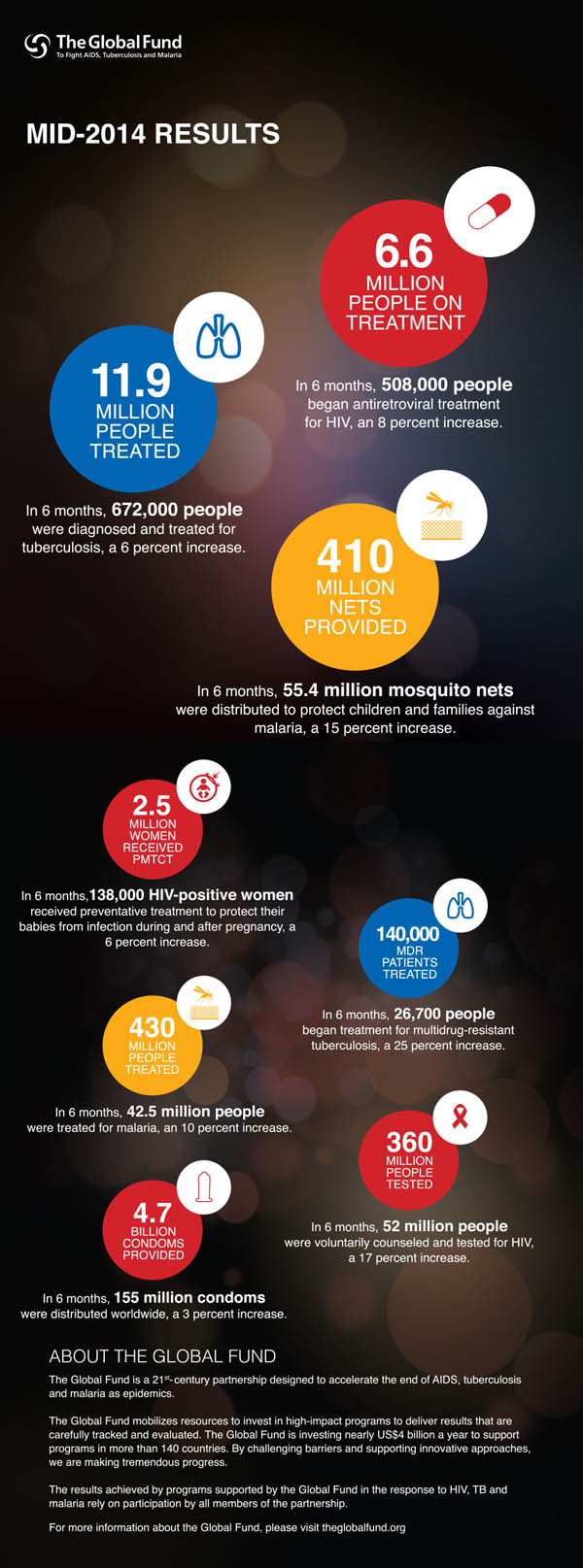 Mid-2014 ResultsThe Global Fund announced on 17 July 2014 that 6.6 million people are getting antiretroviral treatment for HIV through programs supported by Global Fund grants, with particularly strong gains in Nigeria, Mozambique, India, and Uganda this year. In mid-year results for 2014, the Global Fund also reported that programs supported by its grants have distributed a total of more than 410 million mosquito nets to protect children and families against malaria, an increase of 14 percent. In addition, 11.9 million people have been treated for tuberculosis in programs supported by the Global Fund. In the first half of 2014, the number of people treated for multidrug resistant tuberculosis rose to nearly 140,000 from 110,000. |
