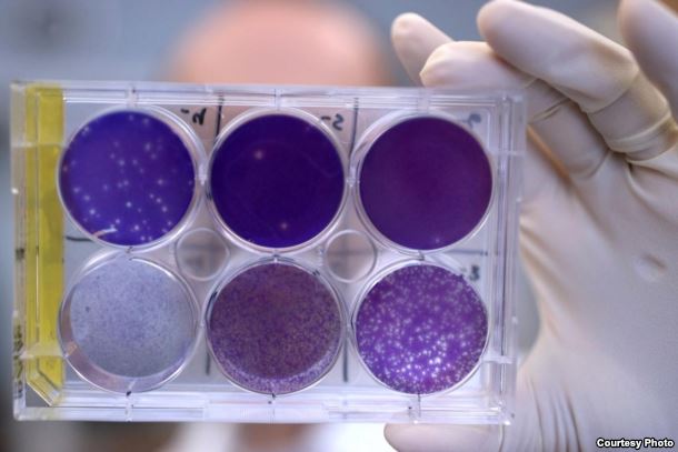 A researcher holds a tray of Zika virus growing in animal cells at Washington University School of Medicine in St. Louis, Missouri. Researchers have identified a human antibody that prevents, in pregnant mice, the fetus from becoming infected and the placenta from being damaged. The antibody also protects adult mice from Zika disease. (Photo courtesy of Huy Mach) |