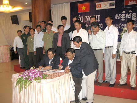 The participants discussed and unanimously approved the contents of the MOU on malaria control at the border of Dak Lak and Mondulkiri province. After the discussion, Mr. Nay Nguyen-Deputy Director of the Provincial Health Department and Head of the provincial VGF Malaria Control PMU of Dak Lak and Mr. Ket Se Xieng - Director of the Provincial Health Department of Mondulkiri carried out the signature of the MOU.  |