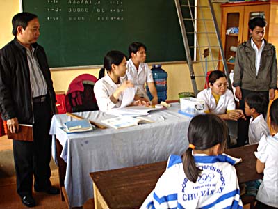 Nguyen Van Chuong, MD., PhD., Vice-director IMPE-QN monitoring the mass deworming campaign in a primary school of Dak Nong province |