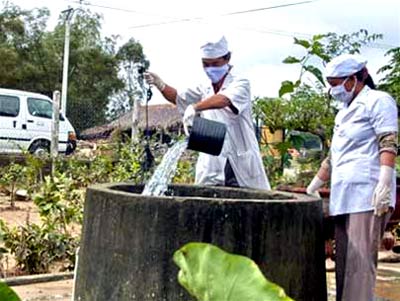 Medical workers from Danang Centre of Medical Prevention treating flooded wells for water sanitaion. |