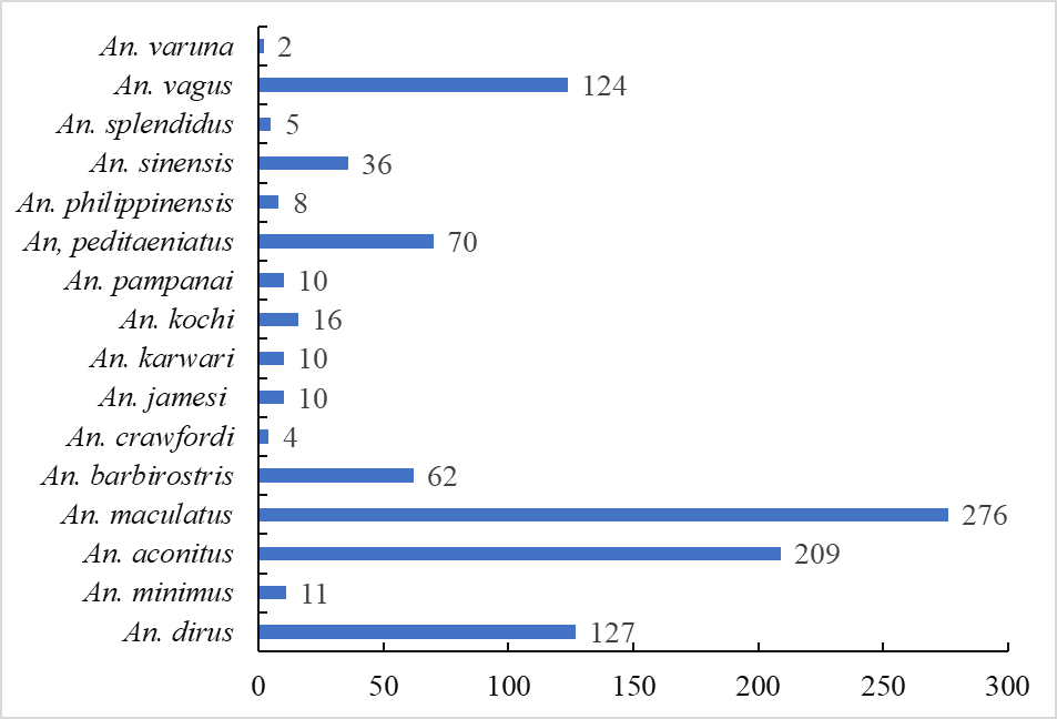 In the overall survey of all three communes, Anopheles maculatus predominated over the other species, with a total of 276 individuals. Out of the 16 collected species, four were malaria vectors, including the primary vectors Anopheles minimus and Anopheles dirus, as well as two secondary vectors, namely Anopheles aconitus and Anopheles maculatus.
