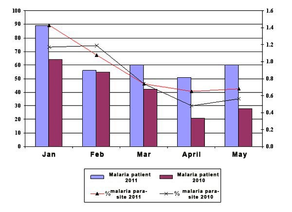According to the graph showing the malaria situation in Binh Thuan from January to May 2011, malaria patient and parasite rate increased continuously, previous month higher than following month, in which the malaria patient rate in May 2011 got a high raise of 114.24% (60/28) over the same period of last year, no deaths from malaria.The malarial indexes raised in most districts, especially boisterously and continuously in the coastal commune of Binh Thanh (Tuy Phong district) with high risk of malaria outbreaks.
