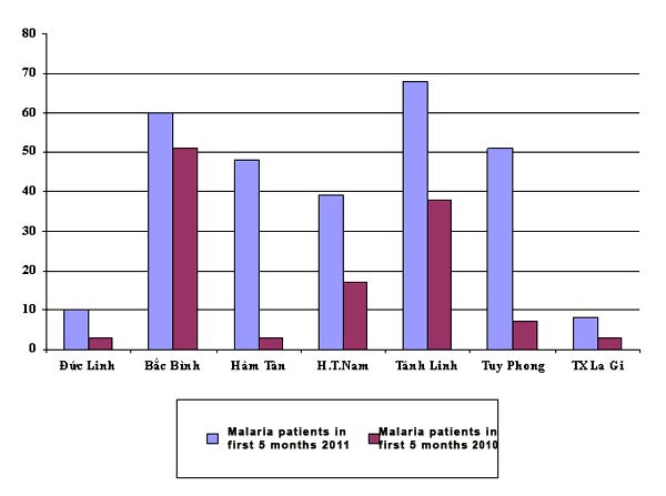 The district malarial data of first five months 2011 showed a constant growth, with Duc Linh by 233.3% (10/3), Bac Binh 17.65% (60/51), Ham Tan 1500% (48/3), Ham Thuan Nam 129.41% (39/17), Tanh Linh 78.95% (68/38), Tuy Phong 628.51% (51/7), La Gi 166.67% (8/3).