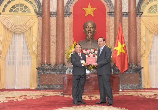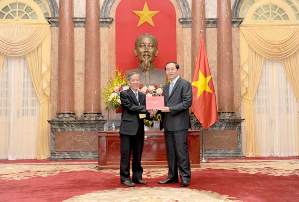 Assoc.Prof. Trieu Nguyen Trung, Assoc.Prof. Nguyen Van Chuong were honourably offerred commomerative presents by President Tran Dai Quang at the "60th Anniversary of Preventive Medicine". |