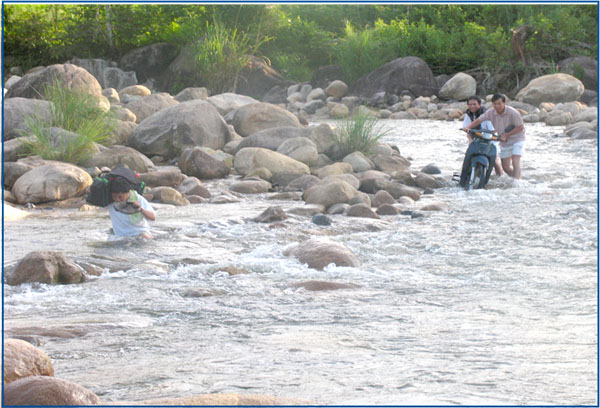 Institute staff crossing stream in their mission at the field. |