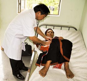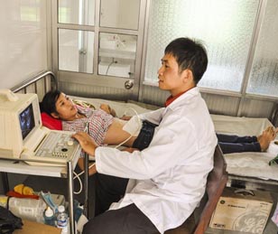 Dr. Nguyen Van Chuong examining people at Vinh Kim commune | Staff of IMPE-Quy Nhon diagnosing by ltrasound scan |