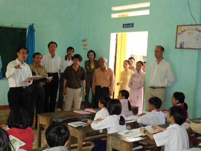 The Institute leadership together with WHO's experts supervising the mass deworming campaign in a primary school of Quang Nam province |