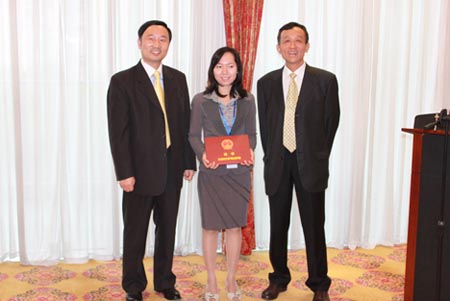 Mr. Li Dongjiu and Mr. Yu Zhenmin - President and Vice-President of Fosun Pharma Development Co., Ltd. awarding the certificate to the Seminar's participant. |