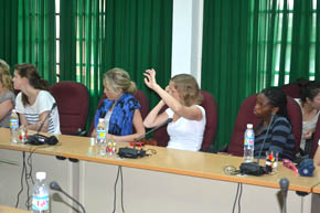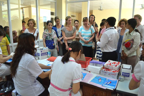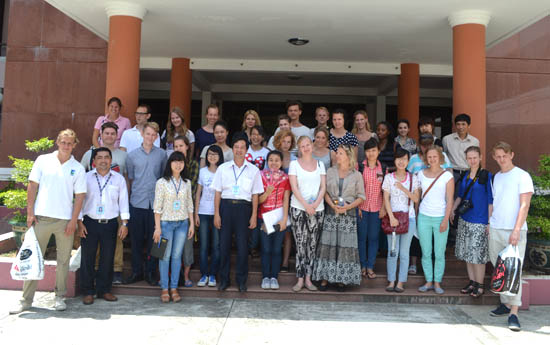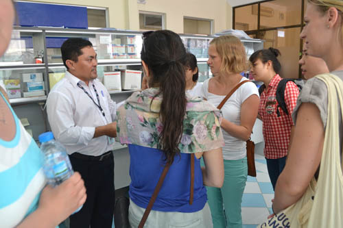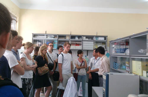 The Institute representatives welcoming the study delegation of 31 students (25 Swedish students and 06 Vietnamese students) included Dr. Ho Van Hoang-Deputy Director and the staff of International Cooperation Department. on behalf of the delegation, MSc. Nguyen Thi Minh Thoa (HaNoi Medical University) introduced the purposes, significance and work program of this study tour to Vietnam, specifically Binh Dinh province. Then, Dr. Ho Van Hoang delivered overall introduction of functions, responsibilities and scientific research work of the Institute, especially activities of controlling malaria, other parasitic and vector-borne diseases which make the Swedish medical students (from a temperate country) really amused. In the discussion, the students also showed interest in the matters pertaining to malariology, parasitology and entomology in Central Vietnam; local epidemics; the Institute human resources and medical equipments; the cooperation between the Institute and international organizations & NGOs; medical diagnosis and treatment of malaria, other parasitic and vector-borne diseases, healthcare and medical insurance at the Institute specialised clinic, etc.