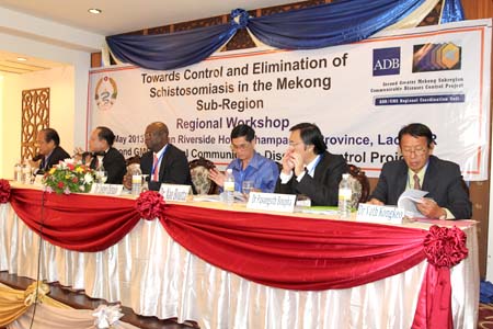 On 9-10 May, 2013, the Infectious Diseases Project held the workshop on "Towards control and elimination of Schistosomiasis in the Mekong Sub-Region" in Champasak province, Lao PDR. Participants to the workshop included representatives from 7 countries of the Mekong sub-region of China, Cambodia, Myanmar, Indonesia, Thailand, Lao PDR, Vietnam and experts of World Health Organization (WHO), ADB project and leaderships of the Ministry of Health of Lao PDR, Health Services of Champasak province.