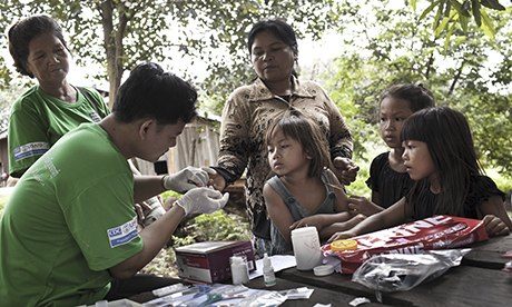 A village health worker tests a woman for malaria in Pailin as part of Malaria Consortium's Malaria Eradication Scientific Alliance (MESA) project. Photograph: Patrick Brown |