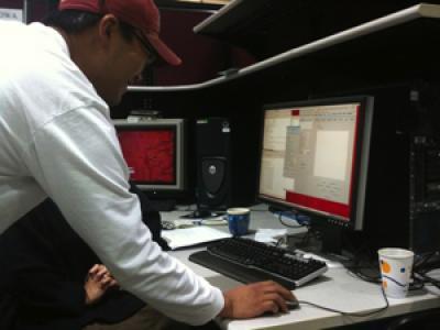 Soon Goo Lee, a doctoral candidate at Washington University in St. Louis, about to click the mouse button to see whether six years of work will pay off and he will be the first to see the structure of a protein no one has ever seen before. The protein is a key enzyme made by a variety of organisms, includingPlasmodium falciparum, the protozoan that causes the most lethal form of malaria. This cellphone photo was taken by his adviser, Joseph Jez. (Photo Credit: Joseph Jez) |