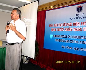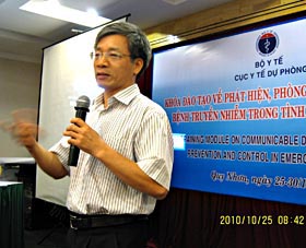 Implemeting the plan of the long-term epidemiology training programme 2010, on 25-30 October 2010, the Department of Preventive Medicine (MoH) in collaboration with the Vietnam's Field Epidemiology Training Program (FETP) have held "Training course on Communicable disease detection, prevention and control in emergency settings" for FETP fellows and external participants responsible for emergency response at provincial level in Central Vietnam at Hoang Yen Hotel, Quy Nhon City.