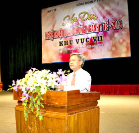 Pharmacist Nguyen Van Quyen - Vice-chairman of Vietnam National Union of Health Workers gives directive speech at the festival. | Dr. Nguyen Van Chuong - Director of IMPE-Quy Nhon in his opening speech at the festival. |