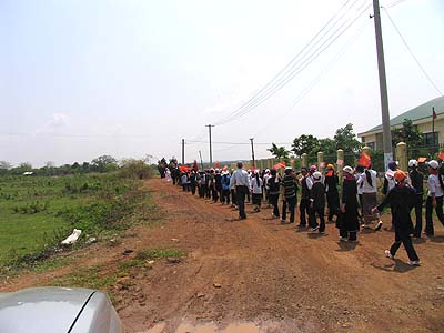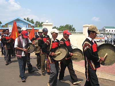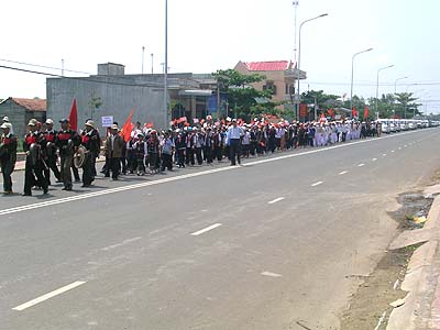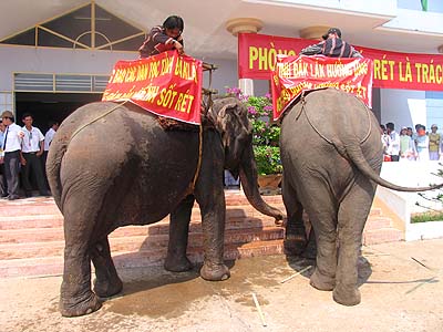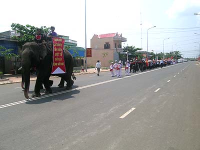 The second but most important part of the ceremony was the march which started from Buon Don district and finished in Buon Ma Thuot city. Participating the march were of the following order: two guiding police cars, two leading elephants (with propagandizing banners sticking two sides of the howdah), followed by a Gong playing band, boarding ethnic school students, district people's committee and health care staff representatives of Buon Don district (in ethnic traditional dress), and a train of about 30 cars (with propagandizing banners sticking on two sides). At the end of the march in Buon Don district, the propaganda cars led by police took a parade in some main streets to Ban Me Thuot city and ended up at the Provincial Health Department Office.